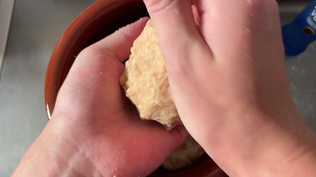 握るとかたまりができるくらい、しっとりとなるまでよく混ぜ合わせます。