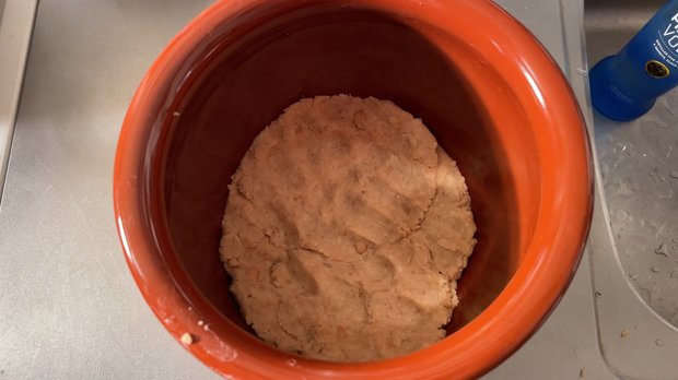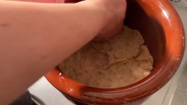 - ⑥を煮豆に加えて混ぜ合わせる。種水を少しずつ入れながら耳たぶくらいの硬さになるように調整する。