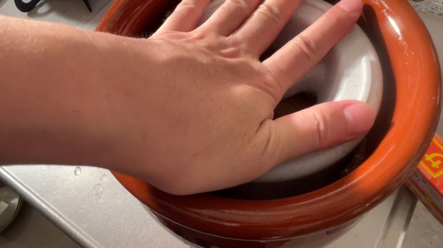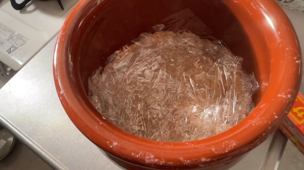 ラップ→漬物蓋→重石を敷いてフタをし、このまま冷暗所で数ヶ月保存します。